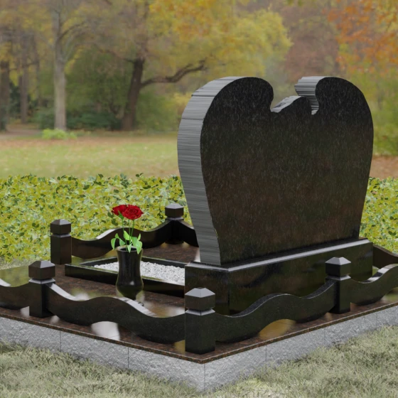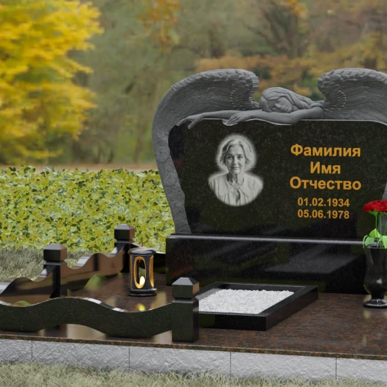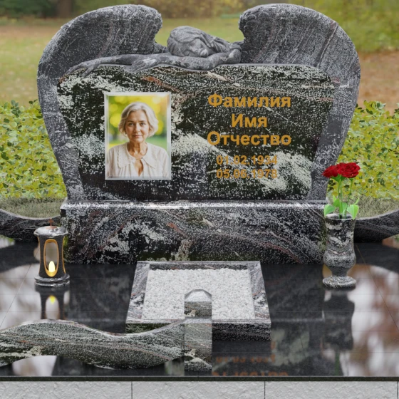 Представленный мемориальный комплекс (Артикул 130) является подлинным шедевром современной ритуальной архитектуры. Это не просто знак памяти, а монументальное художественное произведение, в котором гармонично сплелись суровая прочность природного камня и хрупкая нежность скульптурной пластики. Центральное место в композиции занимает величественная стела, выполненная в уникальном комбинированном стиле. Глубокий, антрацитово-черный массив основной плиты с безупречной зеркальной полировкой служит идеальным холстом для мемориальной гравировки. Его обрамляет искусно вырезанная из светлого камня фигура скорбящего ангела. Мастер добился поразительной детализации: вы можете видеть каждое перышко на мощных, распростертых крыльях, которые словно защищают покой ушедшего человека. Контраст между матовой, фактурной поверхностью резных элементов и глянцевым блеском основного камня создает невероятную визуальную глубину.