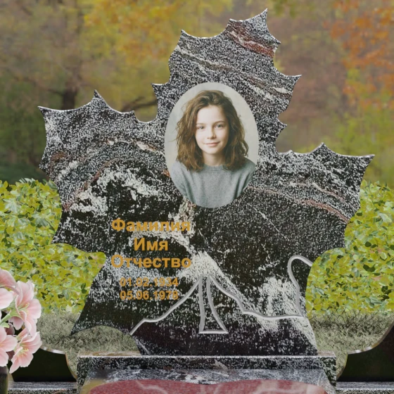Данная мемориальная композиция — это воплощение глубокого уважения и вечной памяти, облаченное в художественную форму. Выбор формы кленового листа не случаен: в мировой символике он олицетворяет силу духа, красоту жизненного пути и мудрость. Каждая линия этой стелы пропитана эстетикой природного изящества. Резные края листа выполнены с филигранной точностью, создавая сложный, многогранный силуэт, который выделяется на фоне классических строгих форм. Плавные изгибы и отсутствие агрессивных углов призваны дарить чувство покоя и умиротворения, подчеркивая, что душа близкого человека обрела вечный приют в гармонии.