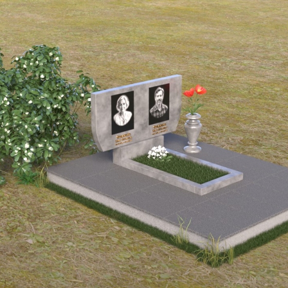 Памятник ПГ015 представляет собой композицию, состоящую из массивной стелы, горизонтальной плиты и тумбы. Стела, выполненная в форме прямоугольника со слегка скошенными верхними углами, создает ощущение надежности и основательности. Зеркальная полировка камня придает ей благородный блеск, отражая свет и создавая игру теней, подчеркивающую глубину и объем. На стеле располагаются два портрета, выполненные с высокой точностью, а также памятные надписи, выполненные золотым шрифтом. Справа от портретов, словно символ вечной памяти, размещена небольшая ваза, в которой можно разместить живые или искусственные цветы.