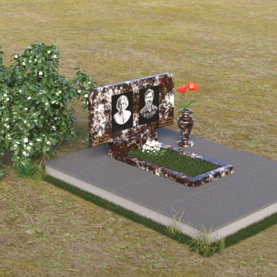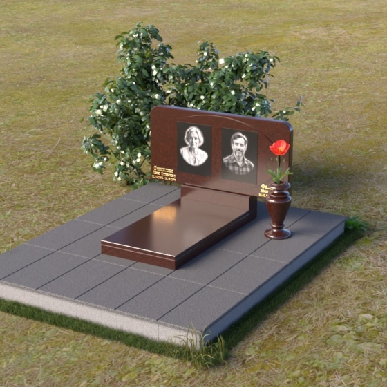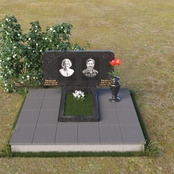 Форма стелы этого ритуального изделия идеально подходит для размещения двух портретов. Композиция с двумя изображениями, выполненными в технике гравировки, выглядит гармонично и сбалансированно. Под портретами можно расположить надпись с именем, датами жизни и короткой эпитафией. Золотое тиснение букв на черном граните создает эффект контраста и придает тексту дополнительную выразительность. Небольшая тумба, расположенная под стелой, служит подставкой для плиты с именами и годами жизни. Рядом с памятником можно установить вазу для цветов, выполненную в том же стиле и из того же материала, что и сам памятник. Это создаст единый ансамбль и подчеркнет целостность композиции. Дополнительно можно установить лампаду или небольшой фонарь, которые будут освещать памятник в темное время суток, создавая атмосферу умиротворения и светлой памяти.