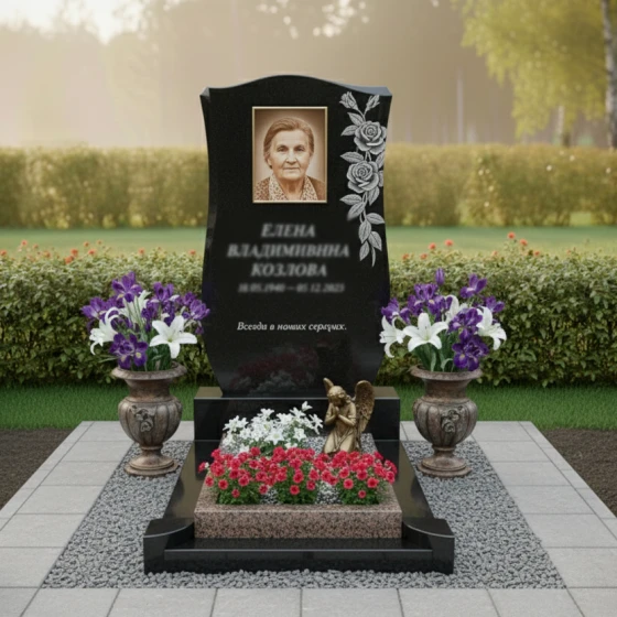 Представляем вашему вниманию ритуальное изделие Артикул: ПН 139 — воплощение глубокой скорби и нежной памяти, запечатленное в камне. Эта надгробная композиция призвана стать достойным символом уважения к ушедшему, сохраняя его образ в вечности. Основу композиции составляет элегантная стела из черного гранита, чьи зеркально отполированные грани искусно отражают окружающий мир, создавая завораживающую игру света и тени. Ее форма напоминает раскрытую книгу или свиток, символизируя жизненный путь, который был пройден, и истории, которые навсегда останутся в сердцах близких. Верхняя часть стелы изящно изогнута, словно мягкая волна, а боковые грани плавно сужаются к основанию, придавая изделию утонченность и легкость, несмотря на массивность камня.