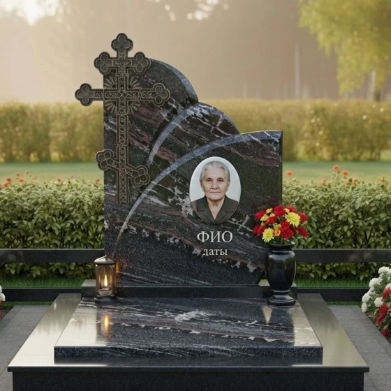 Оформление: Уникальная форма вертикальной плиты идеально подходит для гравировки портрета, выполненного методом лазерной гравировки или ручной работы, что позволит передать все черты лица с максимальной точностью. Размещение портрета по центру, под легкими волнами верхнего края, создает ощущение его защищенности и значимости. ФИО и даты жизни будут гармонично смотреться под портретом, выполненные элегантным шрифтом, который подчеркнет благородство камня. Возможно добавление эпитафии или символических изображений, которые будут ненавязчиво дополнять общую композицию, сохраняя ее лаконичность и достоинство.