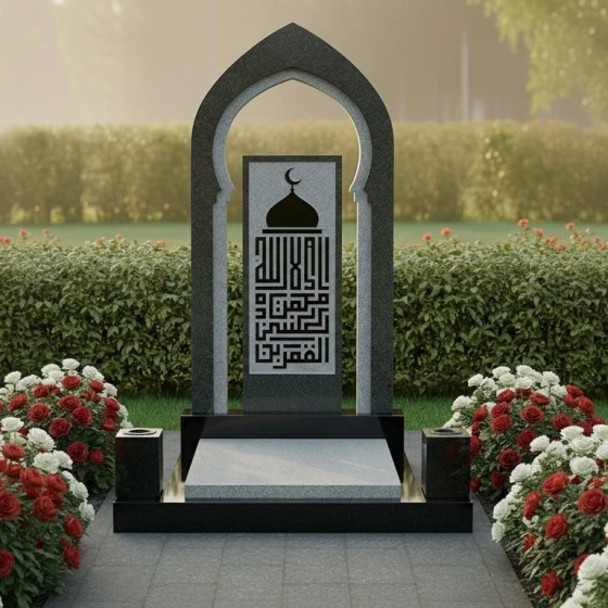 Представляем вашему вниманию модель памятника ПН 506 – это не просто надгробие из натурального камня, а истинное произведение искусства, призванное увековечить светлую память о близком человеке с глубоким почтением и достоинством. Каждая линия, каждый изгиб этого монумента пронизан смыслом и гармонией, создавая ощущение вечности и спокойствия. Центральная стела выполнена в форме изящной арки, напоминающей вход в священное место или портал в иной мир. Ее грани тщательно обработаны, создавая плавные переходы от полированных, зеркальных поверхностей к матовым, словно слегка припорошенным временем, срезам камня. Эта игра контрастов черного и серого гранита придает монументу невероятную глубину и объем, позволяя свету скользить по камню, подчеркивая его благородную текстуру. Внутри арки расположена прямоугольная вставка из светлого гранита, на которой выгравирована сложная каллиграфическая композиция, увенчанная полумесяцем и звездой – символами ислама. Эта гравировка выполнена с поразительной детализацией, где каждый элемент орнамента и каждая буква прорисованы с ювелирной точностью, создавая эффект кружевного узора, который кажется вырезанным из самого камня. Благодаря контрасту светлой гравировки на темном фоне, надпись читается легко и выразительно, притягивая взгляд и приглашая к размышлениям.
