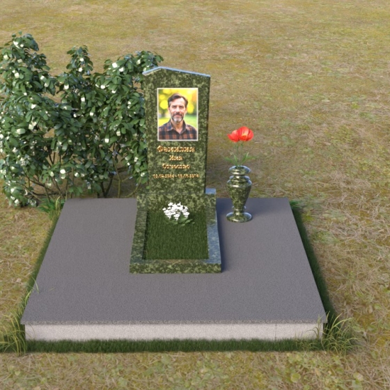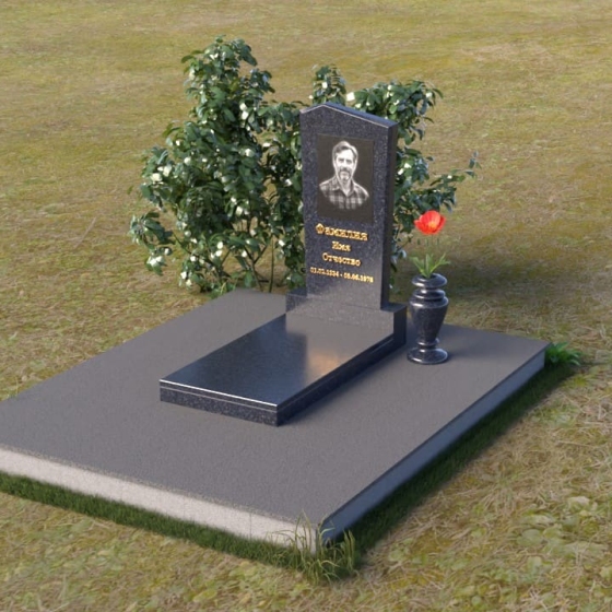 Этот гранитный монумент представляет собой композицию из двух основных элементов: вертикальной плиты с портретом и горизонтальной накладки. Вертикальная плита, возвышающаяся над землей, имеет строгую прямоугольную форму с небольшим скосом в верхней части. Это придает монументу сдержанную элегантность. Зеркальная полировка поверхности отражает свет, создавая ощущение глубины и сияния. На плите выгравирован портрет усопшего, выполненный с высокой точностью и вниманием к деталям. Ниже портрета располагается надпись с именем и датами жизни, выполненная золотым шрифтом. Горизонтальная накладка, расположенная в нижней части, также выполнена из черного полированного гранита и служит своеобразным пьедесталом для вертикальной плиты. Ее гладкая поверхность создает дополнительный контраст с окружающей средой. Рядом с монументом установлена ваза из черного гранита, предназначенная для живых цветов.