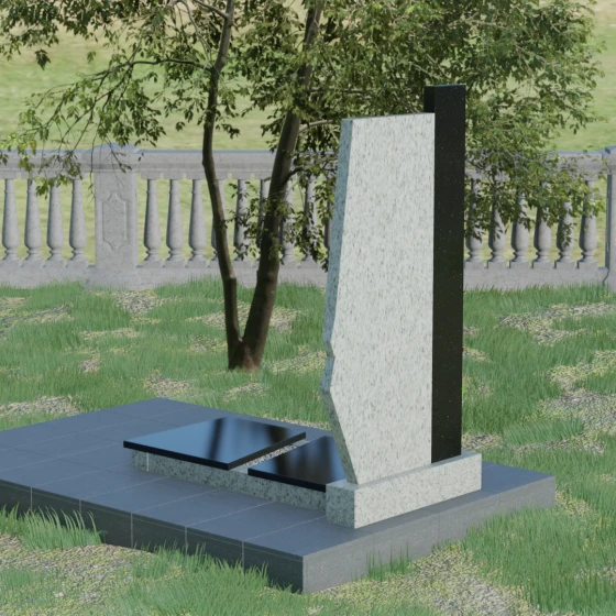 Данная мемориальная композиция — это торжество современной архитектурной мысли, воплощенное в благородном граните. Выбор этой модели обусловлен её уникальной асимметричной геометрией, которая выделяет захоронение на фоне типовых решений. Комбинированное исполнение из двух контрастных видов камня позволяет создать глубокий визуальный акцент: вертикальная колонна из насыщенного красного гранита символизирует духовную опору и жизненную энергию, в то время как основная стела из глубокого черного камня олицетворяет вечный покой и скорбь. Надгробие из натурального камня такой формы выглядит монументально и одновременно изящно благодаря сложной огранке. Правая грань основной стелы дополнена характерным скосом и ступенчатым вырезом, что придает изделию динамику и многогранность. Особое внимание уделено игре света и тени на полированных поверхностях: зеркальный блеск черного гранита отражает небо, создавая эффект глубины, а матовые фаски подчеркивают строгость и чистоту линий архитектурного ансамбля.
