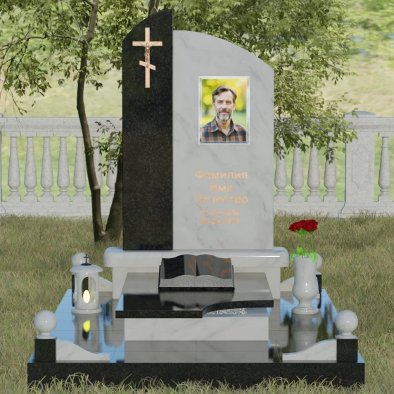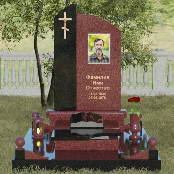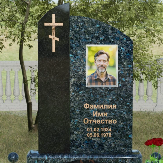 Данное ритуальное изделие представляет собой выразительную художественную композицию, построенную на гармонии двух различных фактур и форм. Выбор этой модели обусловлен её глубоким символизмом: асимметричное разделение стелы на две части олицетворяет земной и небесный пути. Левая часть, выполненная в виде строгого вертикального столпа из насыщенного цветного гранита, служит основанием для объемного православного креста с детально проработанным распятием. Правая же часть, имеющая мягкий, плавный изгиб верхней грани в форме волны, создает идеальное пространство для размещения портрета и памятных слов. Сочетание строгой геометрии и лиричного изгиба позволяет выразить всю многогранность чувств — от глубокой скорби до светлой памяти.