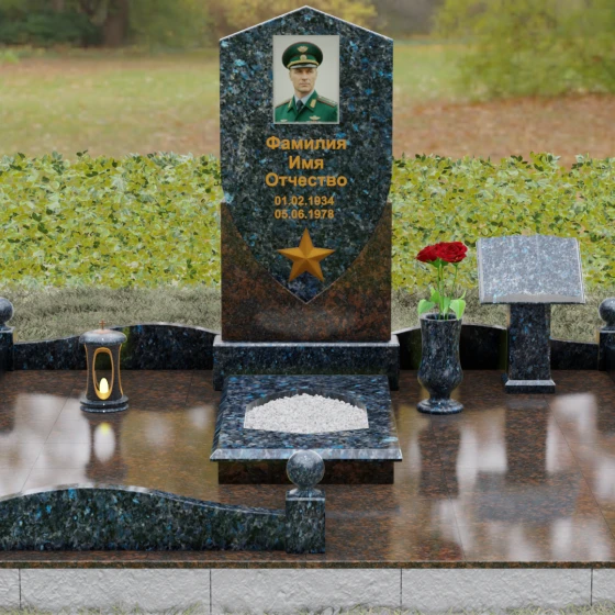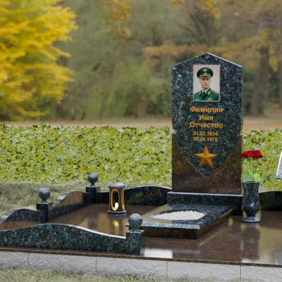 Особое внимание уделено деталям оформления: в нижней части «щита» расположен объемный бронзовый барельеф в виде пятиконечной звезды, символизирующей доблесть и служение отечеству. Благоустройство участка выполнено на высочайшем уровне: по периметру установлен низкий каменный цоколь, углы которого украшены массивными полированными столбиками с навершиями в виде идеальных шаров. Справа от основной стелы располагается дополнительный элемент — мемориальная плита в форме раскрытой книги на постаменте, предназначенная для нанесения эпитафий или памятных слов, что придает комплексу завершенный и гармоничный вид.