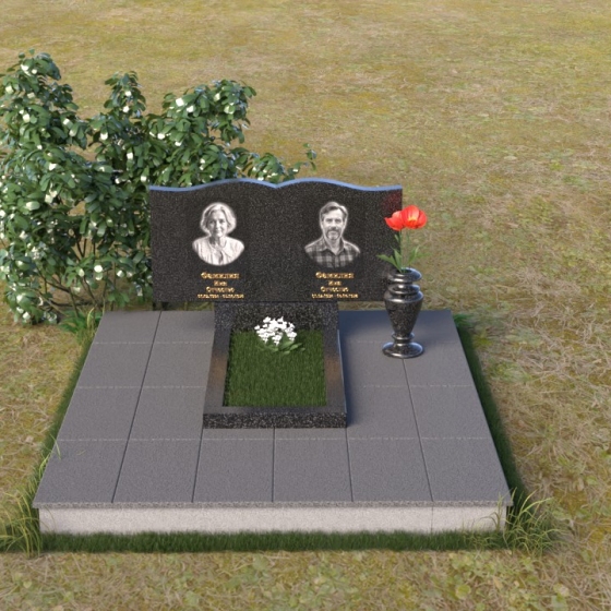 Этот гранитный монумент представляет собой вертикальную композицию, где основной акцент сделан на верхней части. Верхний край памятника имеет сложную, волнообразную форму, напоминающую плавные изгибы морской волны или нежные лепестки цветка. Этот элемент придает монументу легкость и изящество, смягчая строгость камня. Боковые грани монумента обработаны таким образом, чтобы подчеркнуть его вертикальность и стройность. Фаски по краям смягчают переход от лицевой поверхности к боковым, создавая ощущение завершенности и гармонии. Лицевая сторона монумента отполирована до зеркального блеска, отражая небо и окружающий мир, словно запечатлевая в себе вечность. На полированной поверхности выгравированы портреты усопших, выполненные с высокой степенью детализации. Под портретами расположены надписи с именами и датами жизни, выполненные строгим, элегантным шрифтом.