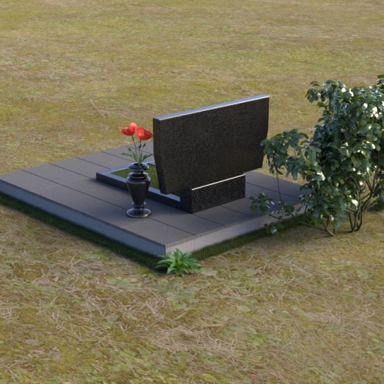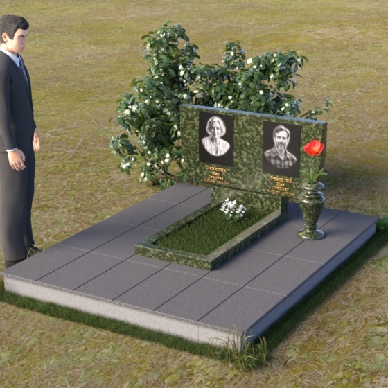 Это ритуальное изделие представляет собой гармоничное сочетание прямых линий и мягких, едва уловимых изгибов, создающих ощущение покоя и умиротворения. Стела имеет прямоугольную форму, но ее верхняя грань слегка скошена, что придает ей визуальную легкость и динамику. Обратите внимание на зеркальную полировку лицевой стороны – она отражает небо и окружающий мир, словно заключая в себе вечность. На полированной поверхности выгравированы портреты усопших и памятные надписи, выполненные с высокой точностью и детализацией. Слева от стелы, на основании, располагается небольшая горизонтальная плита с аналогичной полировкой, создающая дополнительное пространство для цветов или памятных предметов. Основание памятника выполнено из серого камня с матовой фактурой, что создает контраст с блестящей стелой и придает композиции устойчивость и завершенность. Рядом с плитой установлена ваза, выполненная из того же черного полированного гранита, что и стела, что обеспечивает единство стиля и служит достойным обрамлением для живых цветов, символизирующих вечную память.
