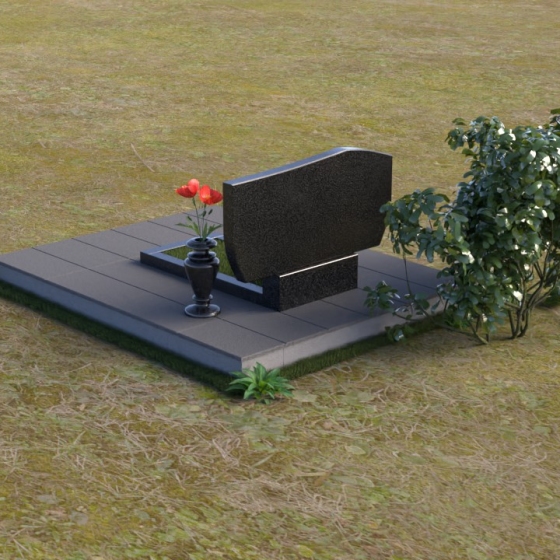 Величественная стела памятника ПГ020 представляет собой монументальное сочетание строгости линий и мягких, сглаженных углов, создающих впечатление надежности и умиротворения. Верхняя часть стелы имеет плавный, волнообразный изгиб, словно склоненная голова в знак скорби и уважения. Боковые грани искусно скошены, образуя элегантные фаски, которые придают памятнику дополнительный объем и глубину. Зеркальная полировка черного гранита отражает небо, создавая ощущение легкости и воздушности, несмотря на массивность конструкции. Нижняя часть стелы переходит в прямоугольное основание, которое надежно удерживает всю композицию. Рядом располагается горизонтальная плита, также выполненная из полированного гранита, создавая дополнительное пространство для цветов или памятных вещей.