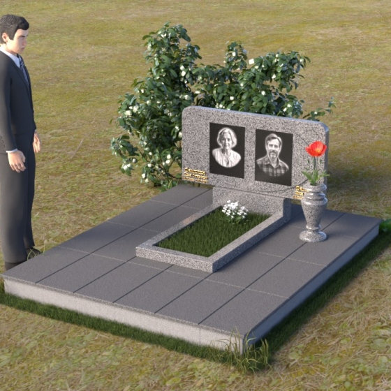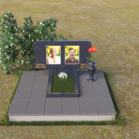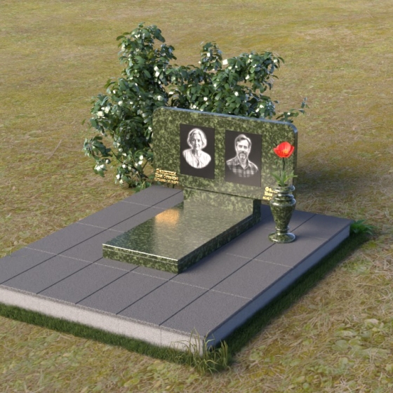 Форма стелы этого ритуального изделия идеально подходит для размещения двух портретов. Композиция с двумя изображениями, выполненными в технике гравировки, выглядит гармонично и сбалансированно. Под портретами можно расположить надпись с именем, датами жизни и короткой эпитафией. Золотое тиснение букв на черном граните создает эффект контраста и придает тексту дополнительную выразительность. Небольшая тумба, расположенная под стелой, служит подставкой для плиты с именами и годами жизни. Рядом с памятником можно установить вазу для цветов, выполненную в том же стиле и из того же материала, что и сам памятник. Это создаст единый ансамбль и подчеркнет целостность композиции. Дополнительно можно установить лампаду или небольшой фонарь, которые будут освещать памятник в темное время суток, создавая атмосферу умиротворения и светлой памяти.