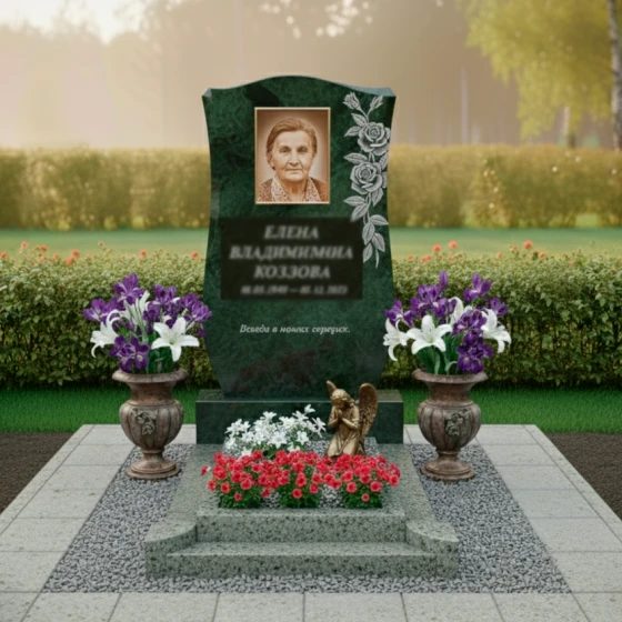 Представляем вашему вниманию ритуальное изделие Артикул: ПН 139 — воплощение глубокой скорби и нежной памяти, запечатленное в камне. Эта надгробная композиция призвана стать достойным символом уважения к ушедшему, сохраняя его образ в вечности. Основу композиции составляет элегантная стела из черного гранита, чьи зеркально отполированные грани искусно отражают окружающий мир, создавая завораживающую игру света и тени. Ее форма напоминает раскрытую книгу или свиток, символизируя жизненный путь, который был пройден, и истории, которые навсегда останутся в сердцах близких. Верхняя часть стелы изящно изогнута, словно мягкая волна, а боковые грани плавно сужаются к основанию, придавая изделию утонченность и легкость, несмотря на массивность камня.